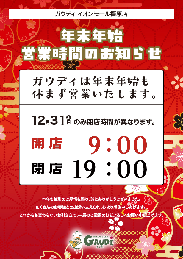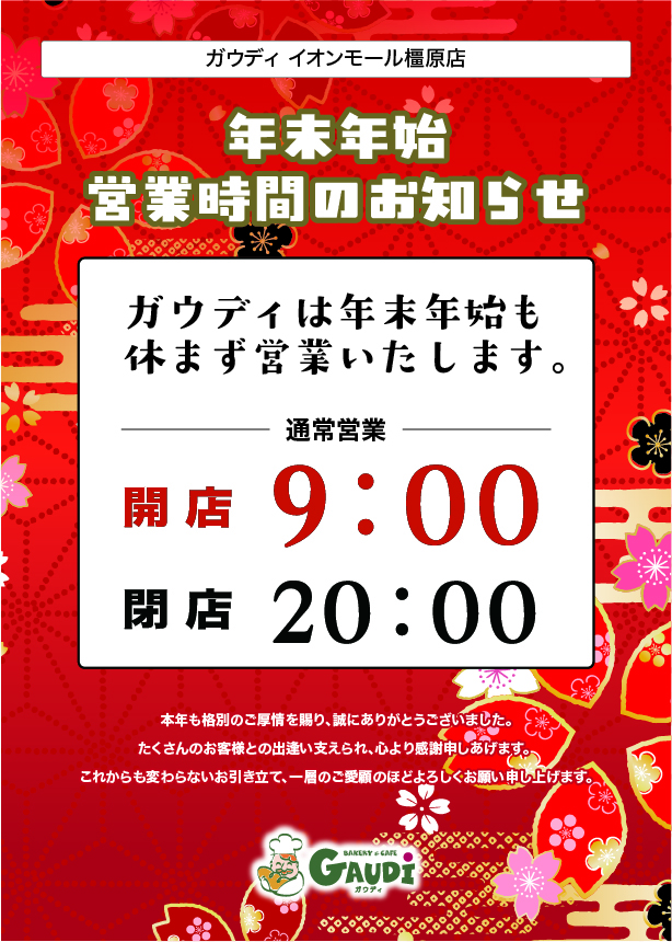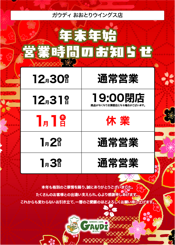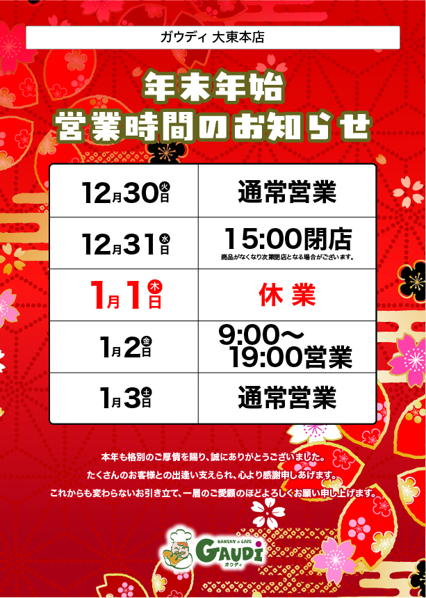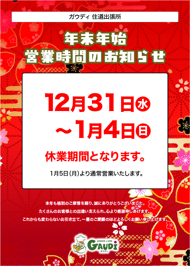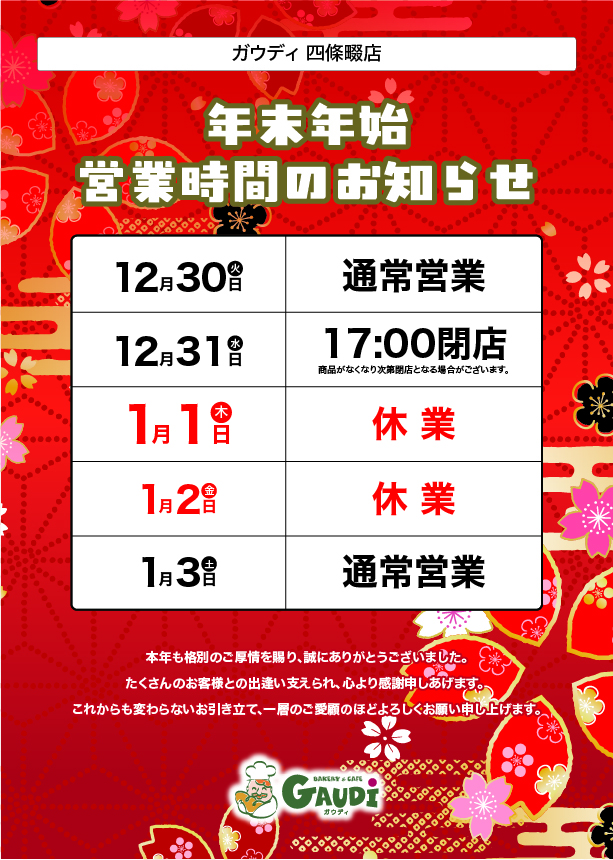 年末年始の営業時間は、下記掲載の通り通常と変更になります。