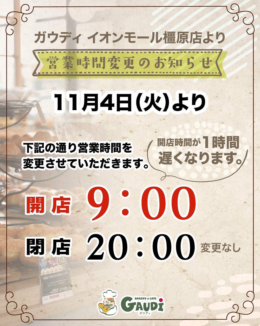 ガウディ(イオンモール橿原店)よりお知らせです。