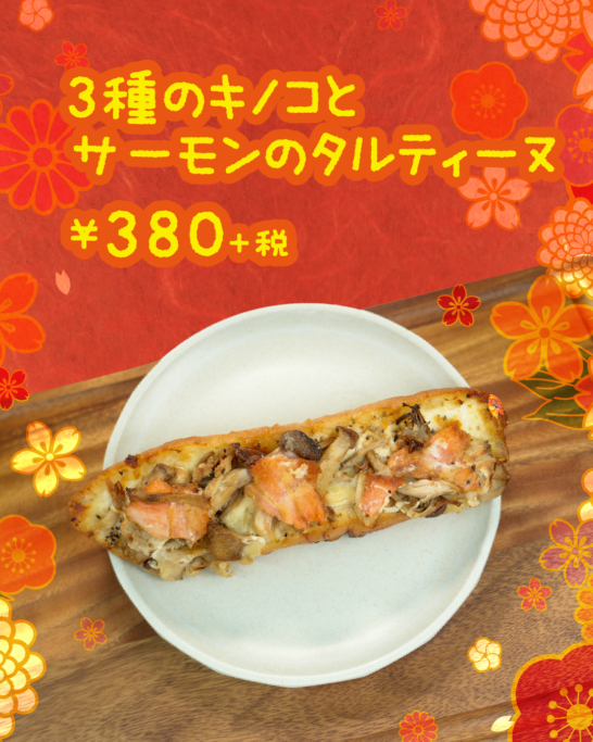 かぶりついた瞬間溢れるキノコの風味とやさしいベシャメルソース。さらにサーモンをトッピングした冬のご馳走タルティーヌ。